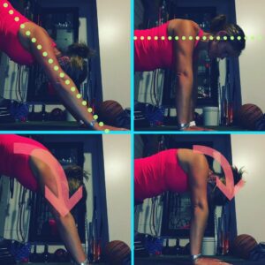- Scap Presses – From Down Dog and Push Up Positions – again, just move the shoulder blades and let your brain get used to that control, stability. Coaches say shoulder blades down and back all the time, let’s practice how to actually do that! From down dog, press the head away from the floor and slowly release, with no movement of the shoulder or elbow joints. From the top of a push up, lower the chest toward the floor and then press it away, doming the upper back, again, without moving the elbows.